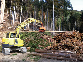 伐採・造材・集材・搬出の作業をしています。プロセッサという重機で、伐採した立木を集めながら長さを切り揃えています。