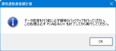 - 事前にバックアップを実行していただきたい旨のメッセージが表示されますので「OK」ボタンをクリックします。