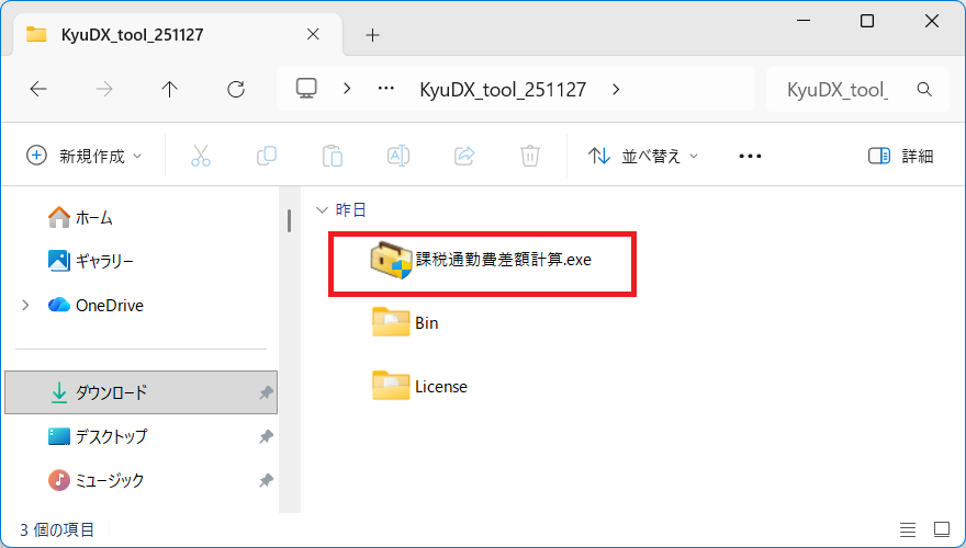 - 展開したフォルダ内の“課税通勤費差額計算.exe”を実行します。