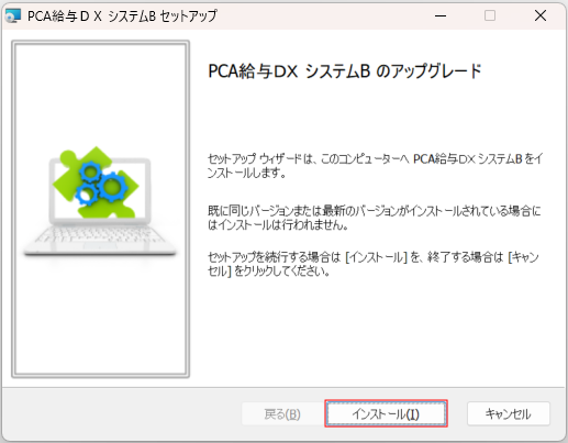 - セットアップ画面の起動後、しばらくすると「インストール」ボタンが表示されますのでクリックします。