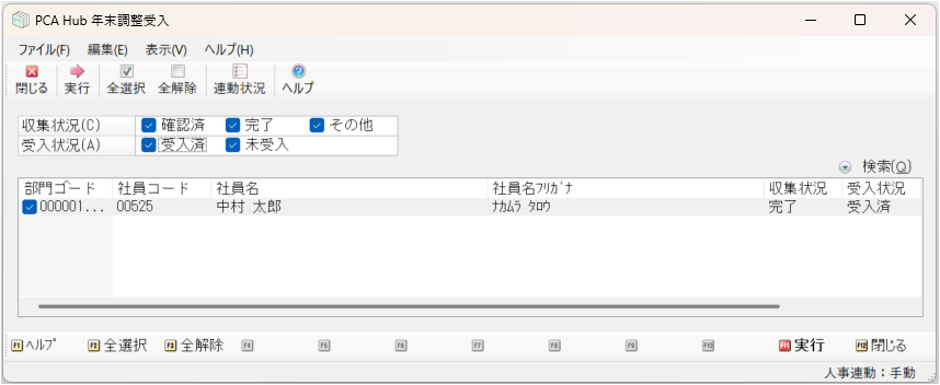 - 「年末調整」-「申告書データ収集」-「PCA Hub 年末調整受入」を起動し、受入を実行します。