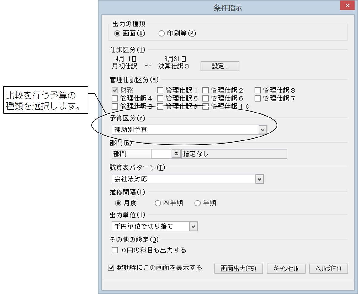 実績との比較を行う予算の種類は、「予算・実績」-「年次予算実績比較表」「月次予算実績比較表」「半期予算実績比較表」「前年比予算実績比較表」「部門別予算実績比較表」「予算分析表」の条件指示画面で選択することができます。