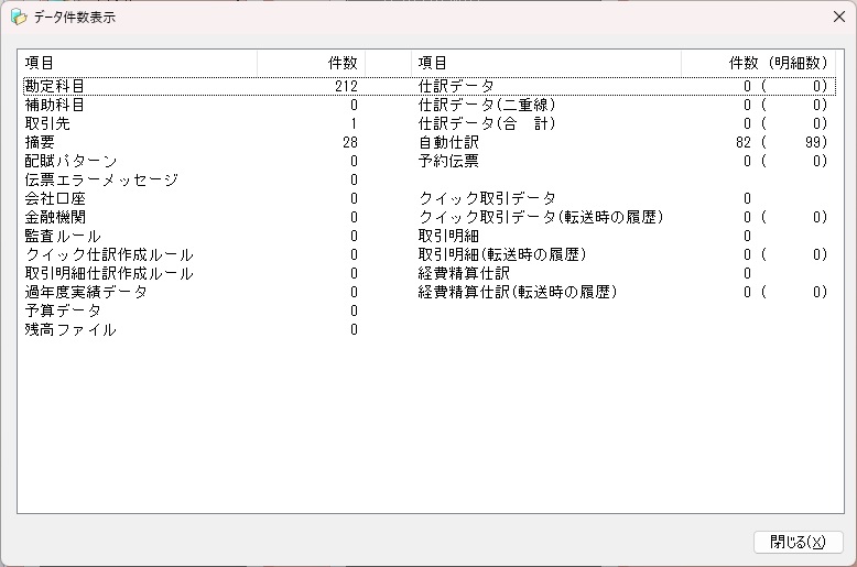 メニューの「ファイル」-「データ件数表示」を選択すると、以下のような画面が表示されます。