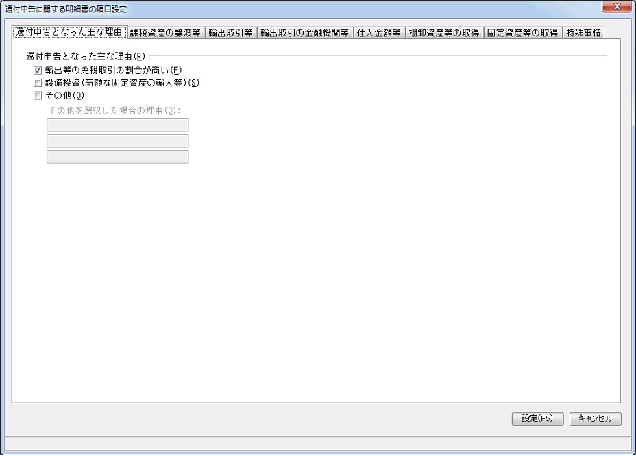 【「還付申告に関する明細書の項目設定」-「還付申告となった主な理由」タブ】