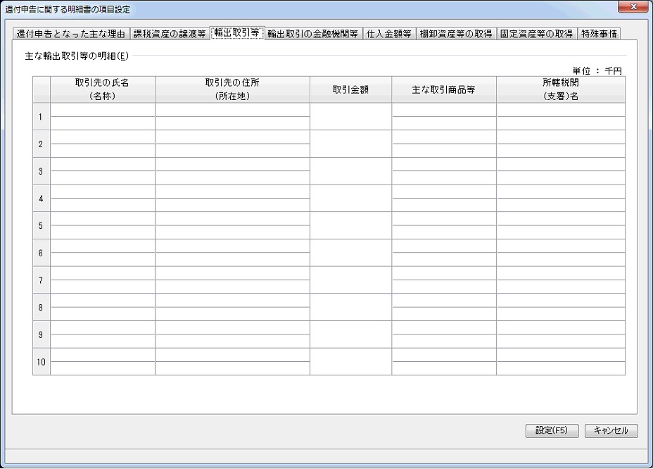 【「還付申告に関する明細書の項目設定」-「輸出取引等」タブ】