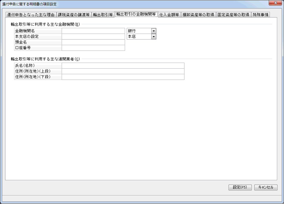 【「還付申告に関する明細書の項目設定」-「輸出取引の金融機関等」タブ】