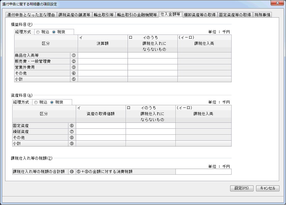 【「還付申告に関する明細書の項目設定」-「仕入金額等」タブ】