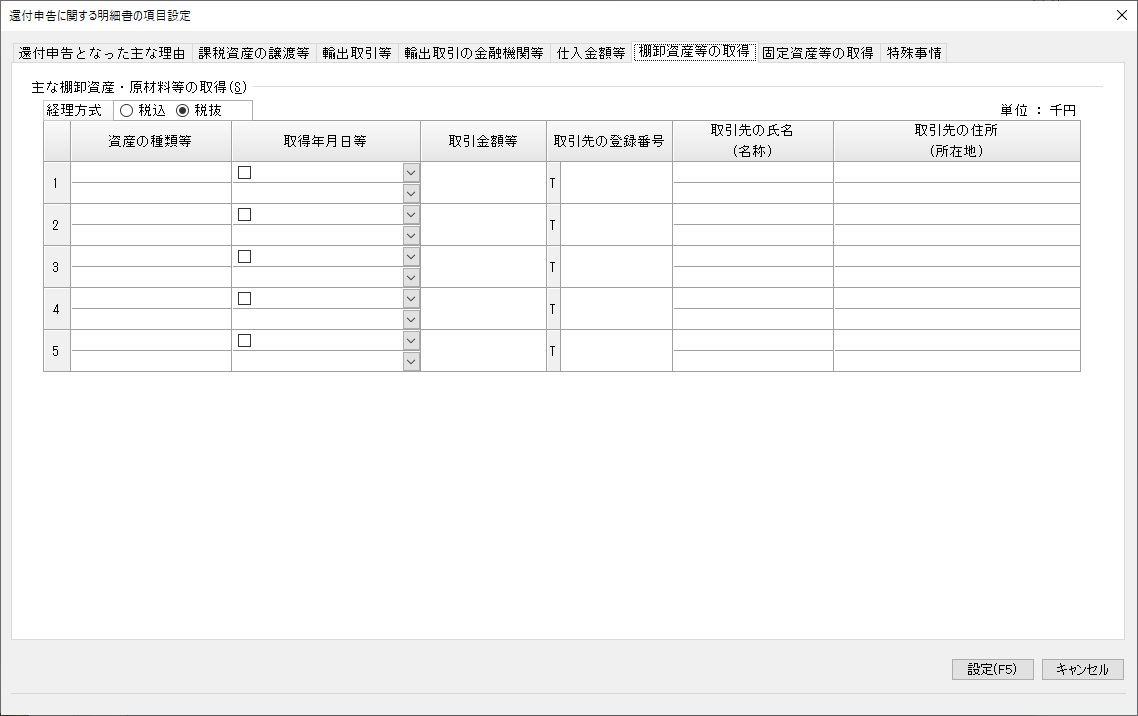 【「還付申告に関する明細書の項目設定」-「棚卸資産等の取得」タブ】