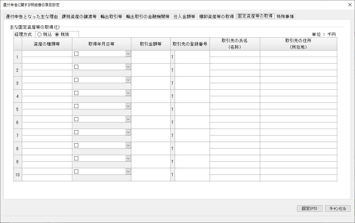 【「還付申告に関する明細書の項目設定」-「固定資産等の取得」タブ】