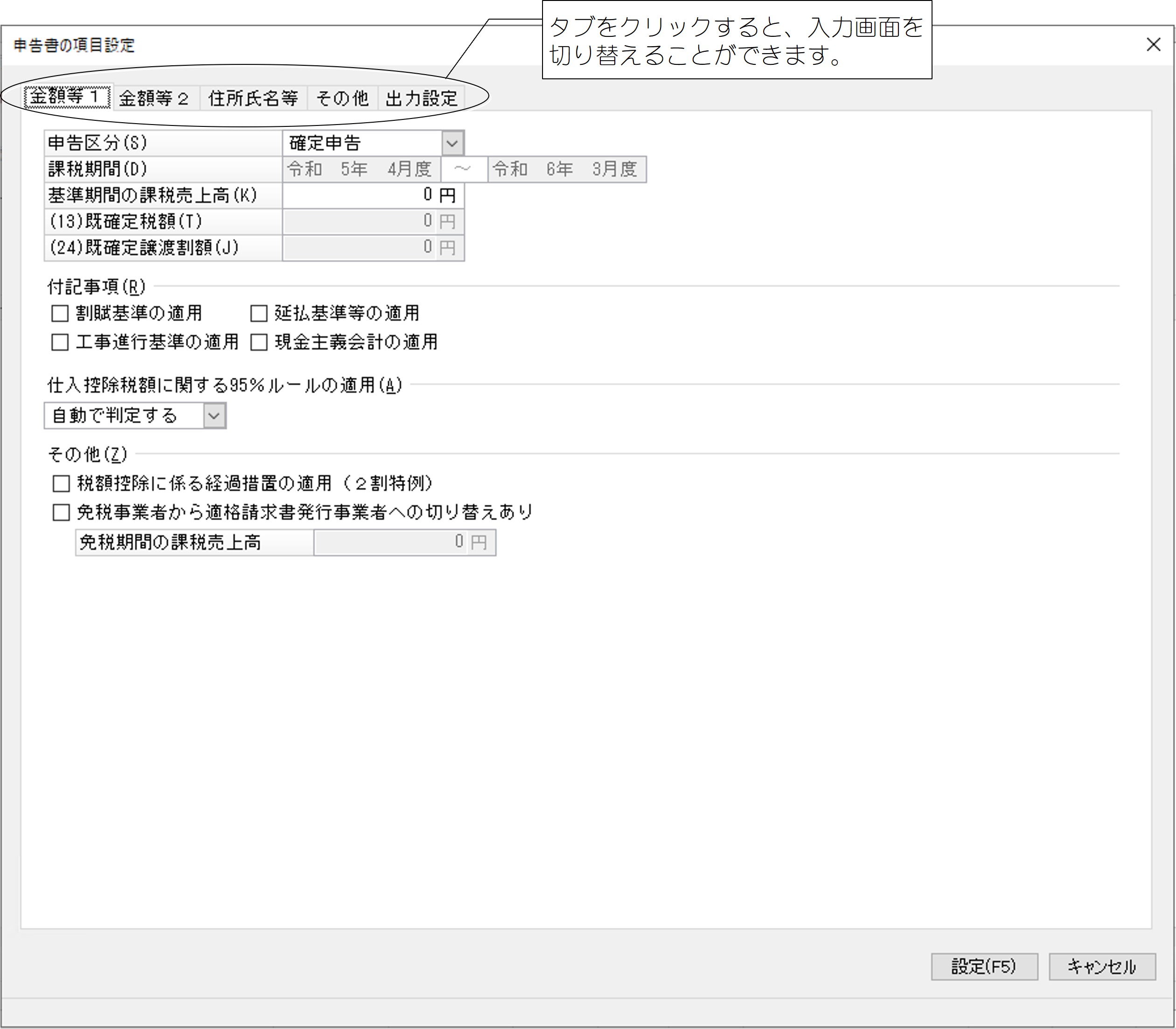各項目の説明については、「入力する項目(申告書の項目設定など)」-【「申告書の項目設定」-「金額等1」タブ】 をご覧ください。