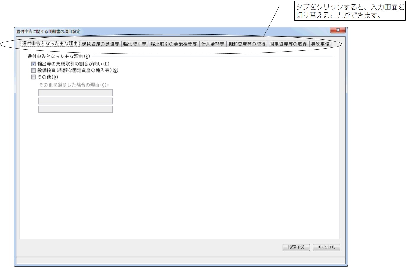 (2)  「還付申告に関する明細書の項目設定」画面が表示されますので、「還付申告となった主な理由」タブの各項目を入力します。