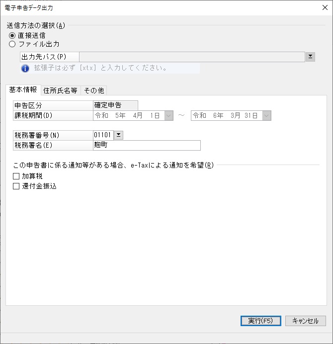 (6)  設定した内容で電子申告データを作成する場合は、[実行](直接送信の場合)、または[出力](ファイル出力の場合)ボタンをクリックします。