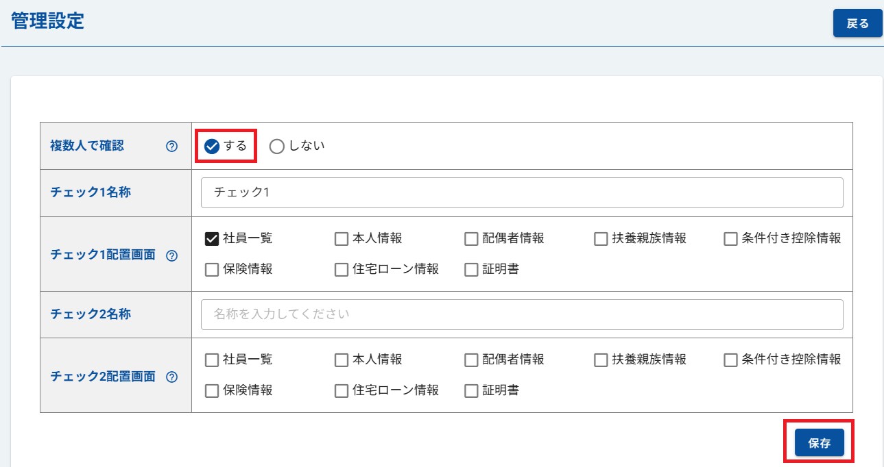 (3) 複数人確認を「する」に設定し、チェック名称や配置場所を設定します。