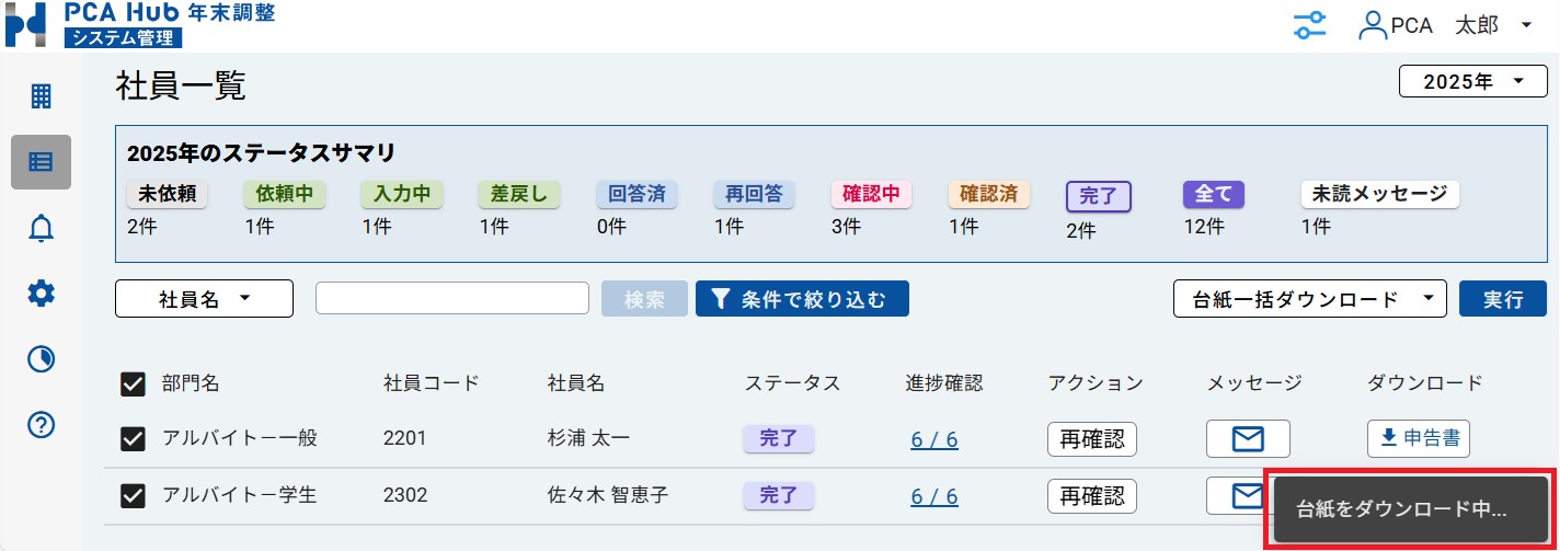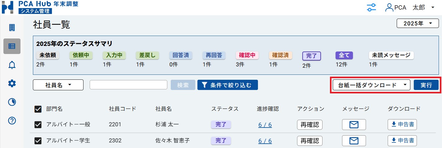(2) 「社員一覧」から申告書のPDF出力をしたい社員を選択し、[PDF一括ダウンロード] を設定して実行します。