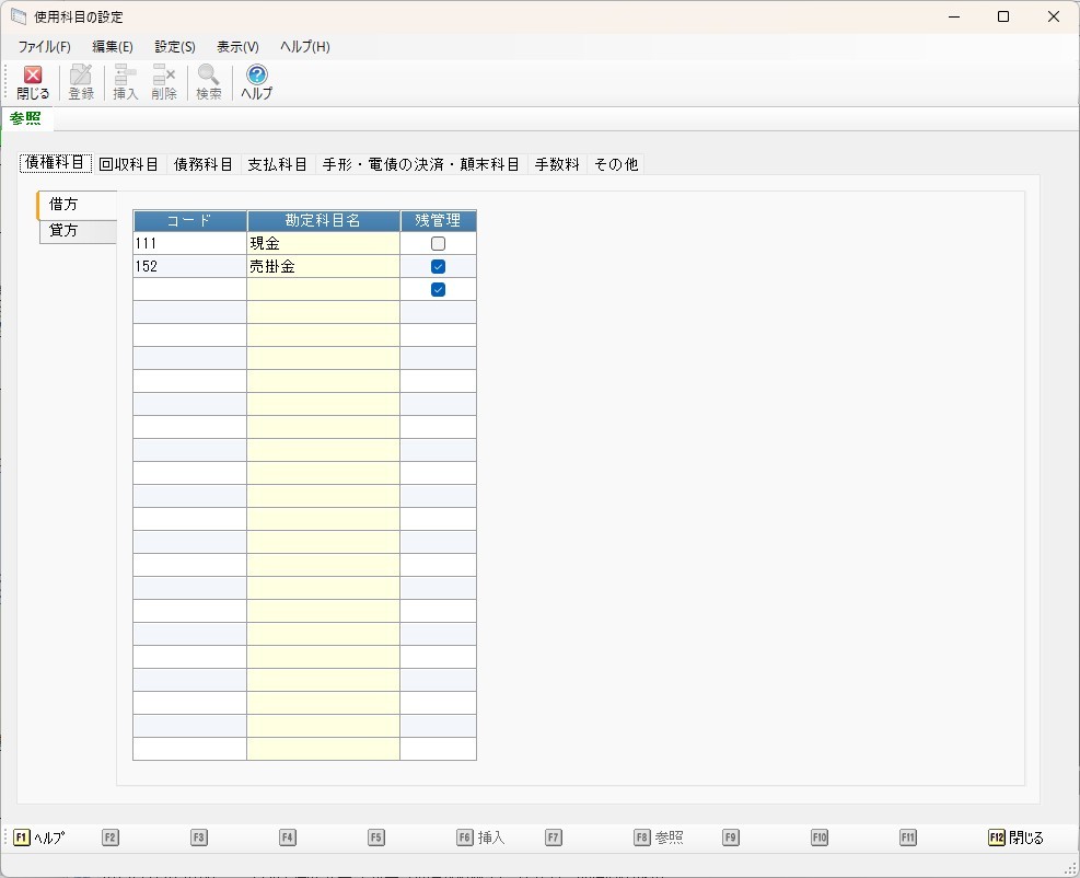 使用科目マスター(メニューの「前準備」-「使用科目の設定」)