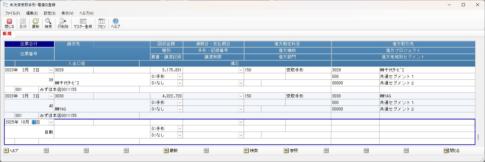 メニューの「前準備」-「残高」-「未決済受取手形・電債の登録」を選択すると、以下のような画面が表示されます。