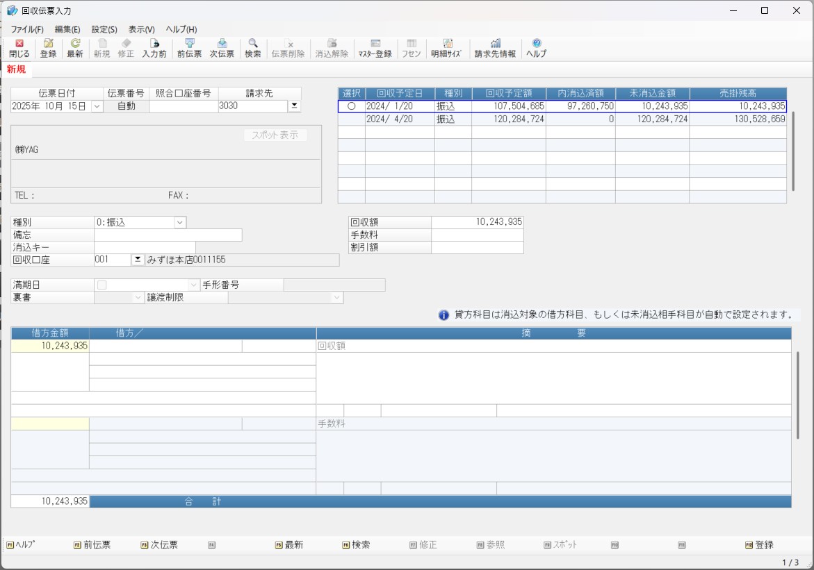 画面下部の明細は3行(回収額、手数料、割引額)まで入力することができます。