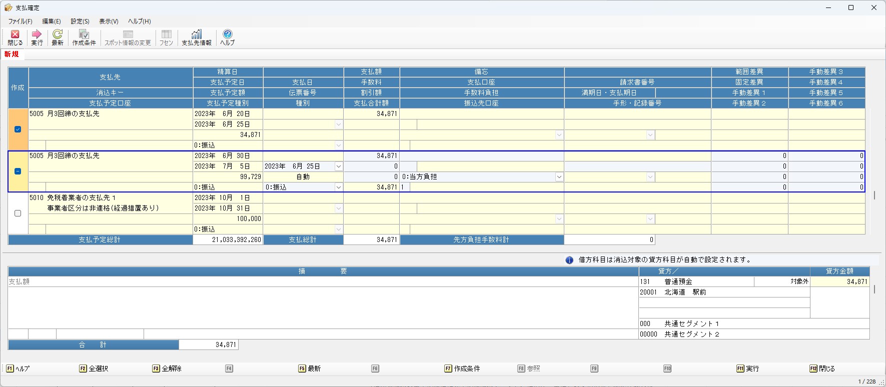 選択された支払予定は支払伝票情報として画面に反映され、必要に応じて別途支払内容を修正して登録します。