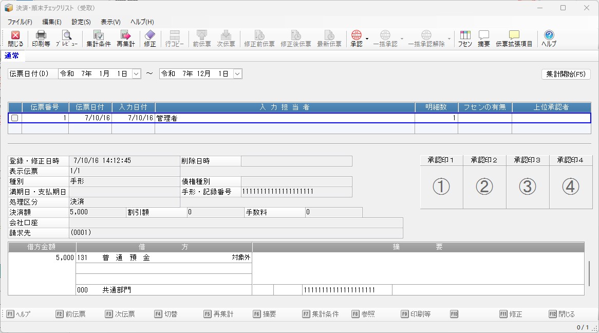 入力された手形・電債の顛末伝票(受取)を印刷したり、入力された伝票のミスチェックを行ったりすることができます。