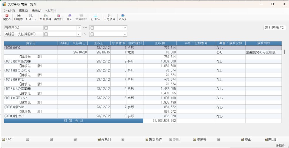 メニューの「債権・債務」-「手形・電債処理」-「受取手形・電債一覧表」を選択すると、以下のような画面が表示されます。