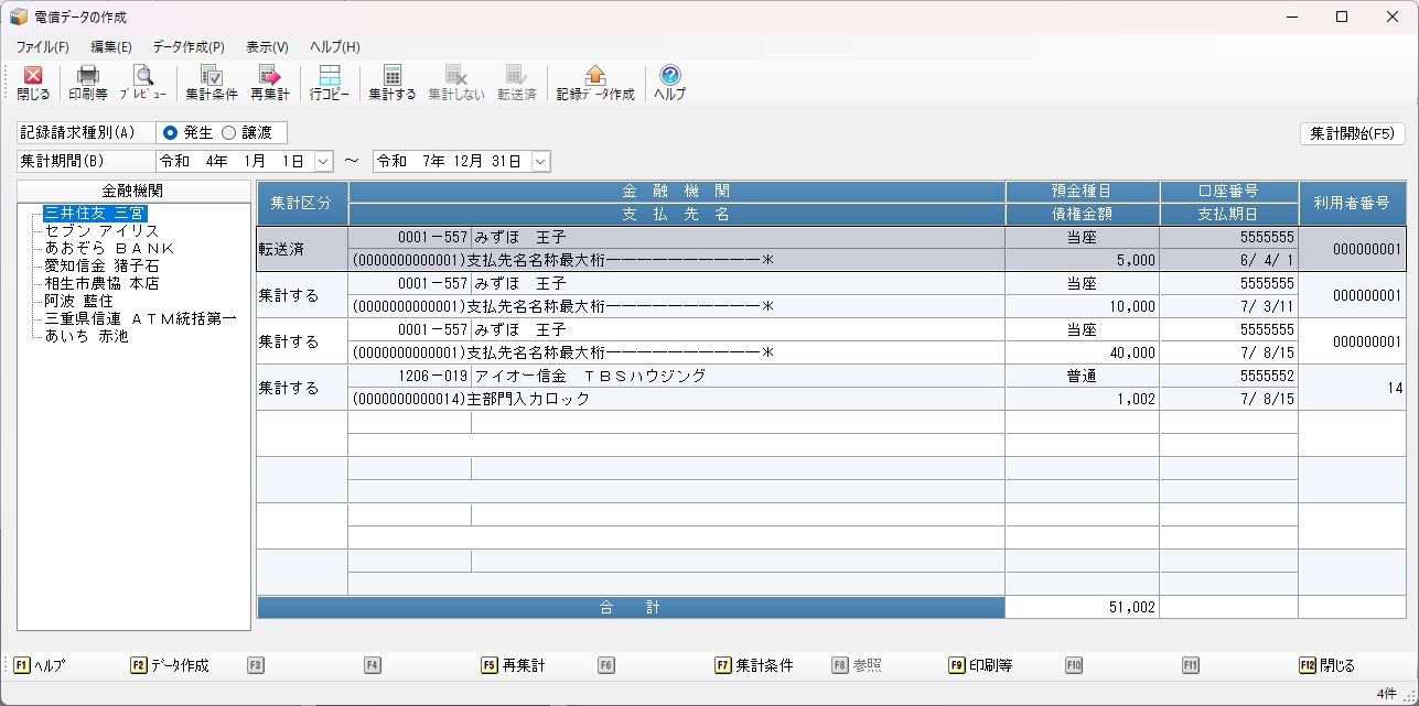 電債データを作成する前に「発生記録請求一覧表」「譲渡記録請求一覧表」を出力すると、データ内容を確認することができます。