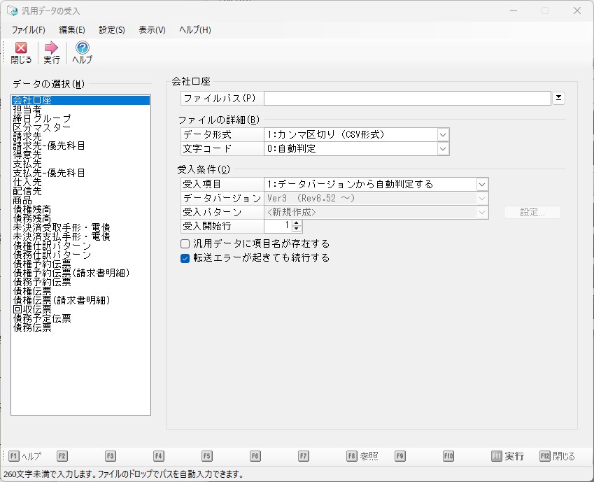 メニューの「随時」-「汎用データの受入」を選択すると、以下のような画面が表示されます。