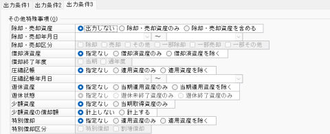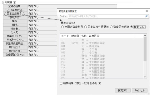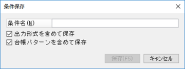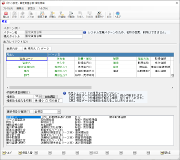 台帳パターンを含めて保存:パターン設定画面で設定した内容を含めて保存する場合にチェックマークを付けます(固定資産台帳(一)、リース資産一覧で表示されます)。