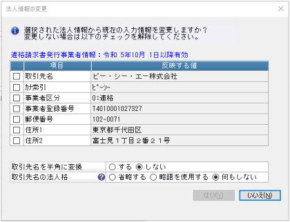 変更チェック:選択した法人情報で現在の入力内容を変更します。反映する値を確認して選択してください。