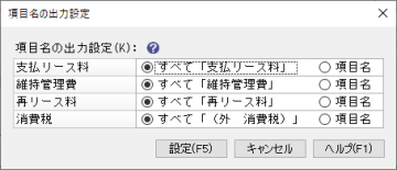 固定資産台帳(一)、リース資産一覧、で、「支払リース料」「維持管理費」「再リース料」「消費税」の詳細な項目名を出力するかどうか選択できます。