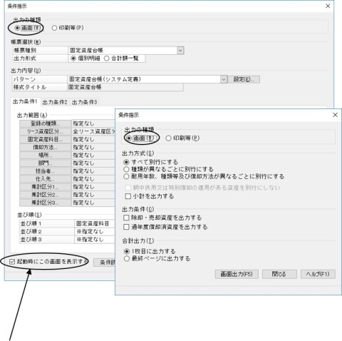 ※ 「条件指示」画面の「起動時にこの画面を表示する」にチェックマークを付けると、処理の起動時に「条件指示」画面が表示されるようになります。