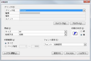 「印刷設定」画面が表示され、プリンタや用紙サイズの設定を行うことができます。 |