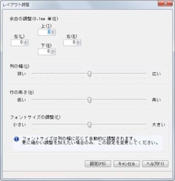「狭い」「広い」の間にあるバーを動かして指定します。「狭い」の方に動かすとフォントサイズが大きくなり、「広い」の方に動かすとフォントサイズが小さくなります。印字する行数が増減しますので、必要に応じて調整してください。