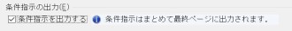 条件指示画面で設定した内容を出力する場合にチェックマークを付けます。 条件指示は最終ページに出力されます。 |