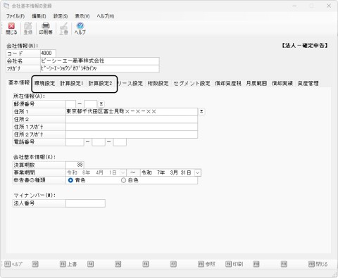 会社名や事業期間を設定するほか、自社の経理事務に設定(環境設定、計算設定1・2タブの項目等)を合わせます。