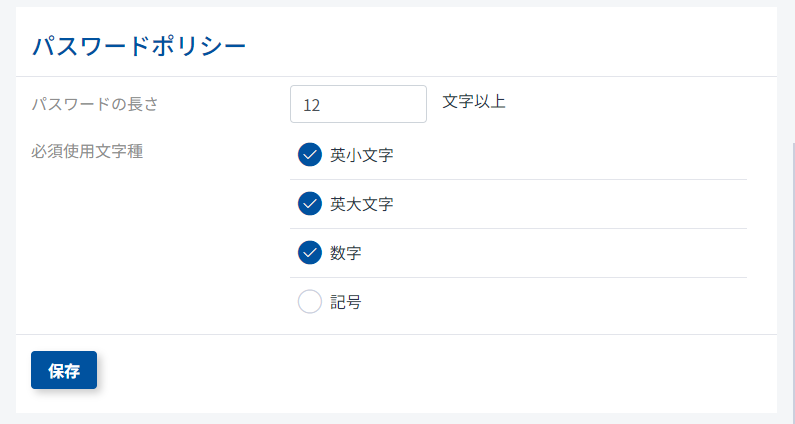 (1) パスワードの長さ、必須の使用文字の種類を設定します。設定後「保存」をクリックします。