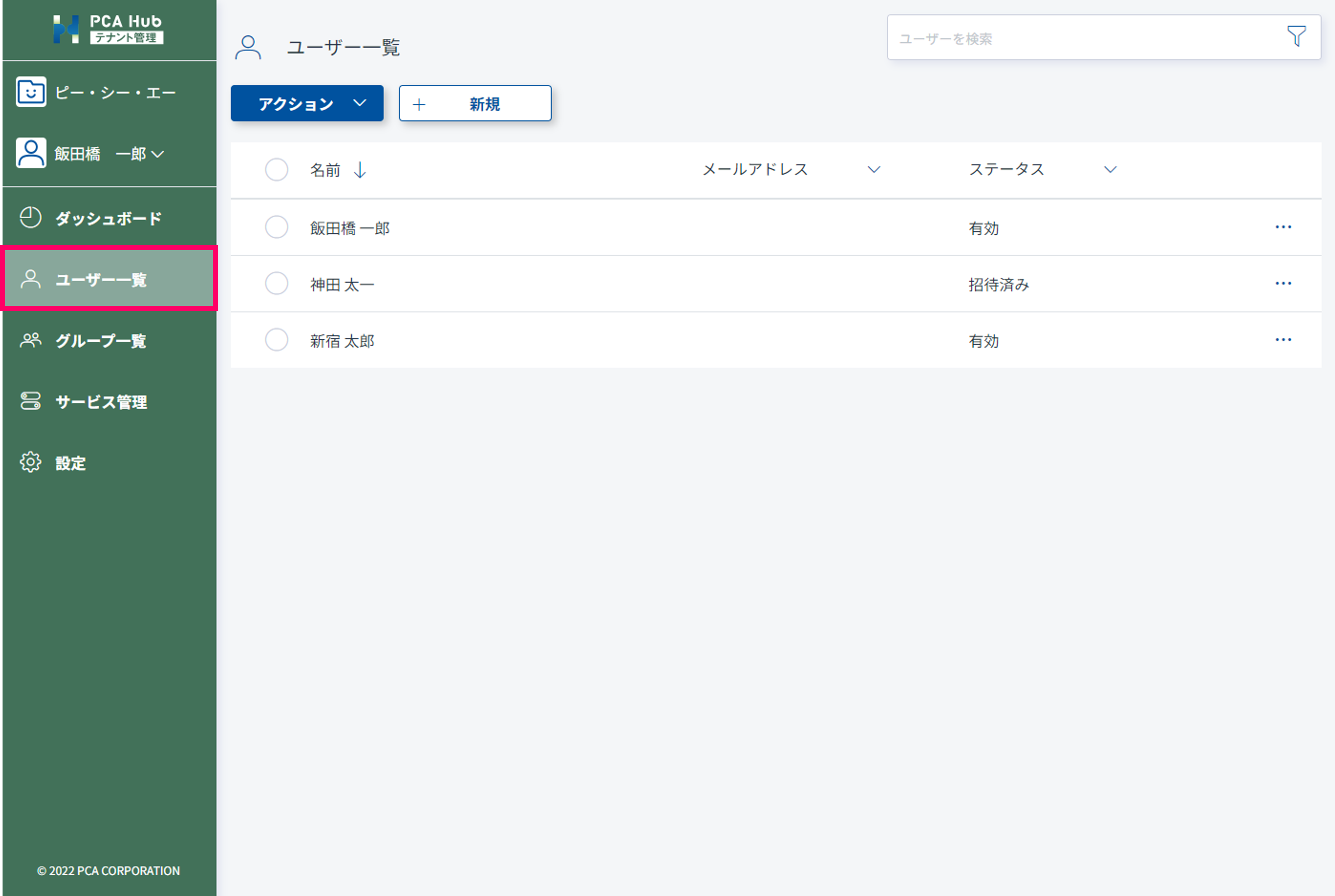 テナント管理メニューの「ユーザー一覧」をクリックします。