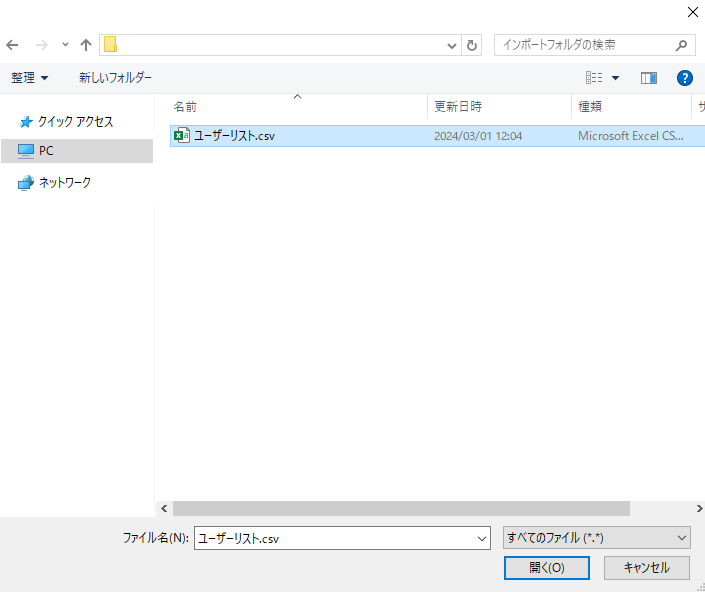 (2) インポートするユーザーファイルフォーマット形式のcsvファイルを選択します。