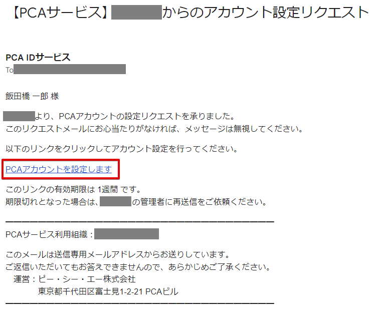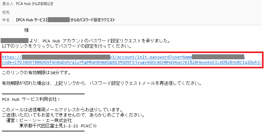 (1) メールアドレスに、【PCA Hub サービス】≪会社名≫からのパスワード設定リクエストが送信されます。
