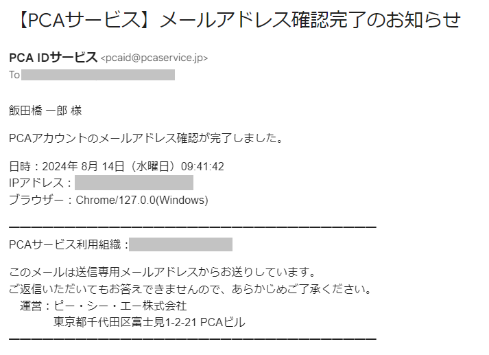 (3) 【PCAサービス】メールアドレス確認完了のお知らせが送信されます。