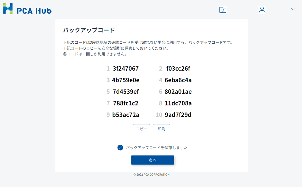 バックアップコードは2段階認証の確認コードを受け取れない場合に利用します。
