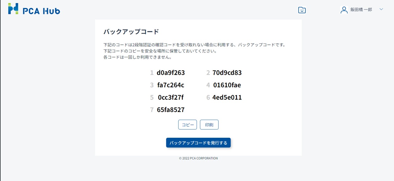 「バックアップコードを発行する」をクリックすると、新しいバックアップコードが発行されます。