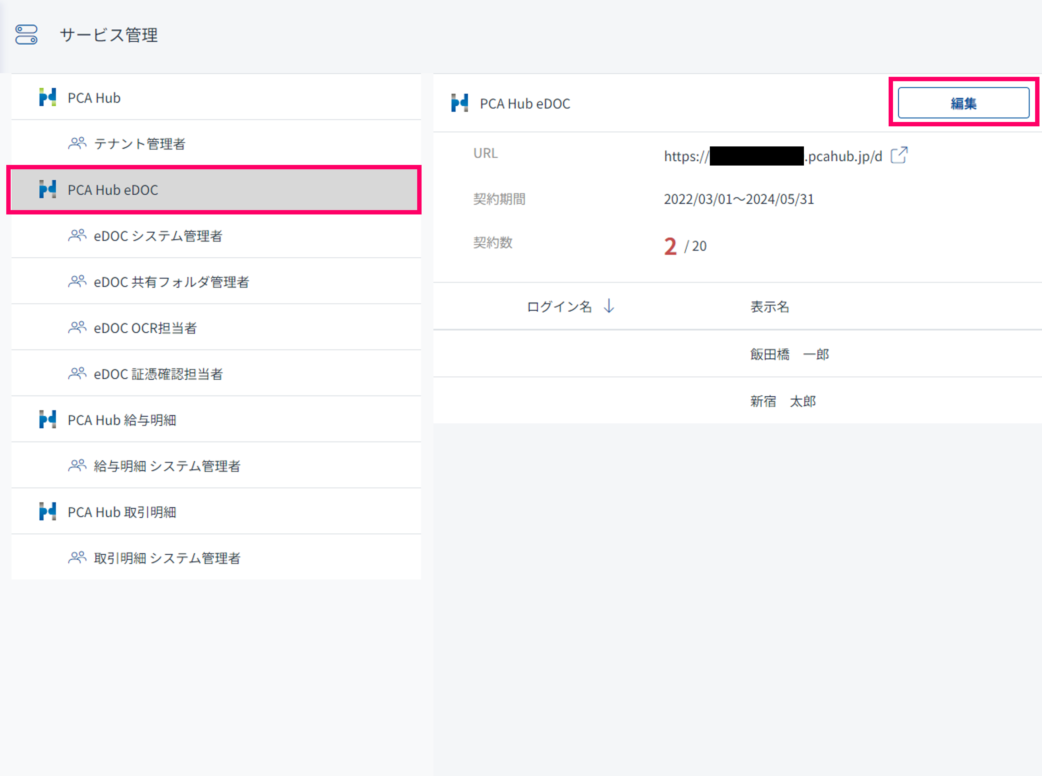 (1) 『PCA Hub eDOC』を選択して「編集」をクリックします。