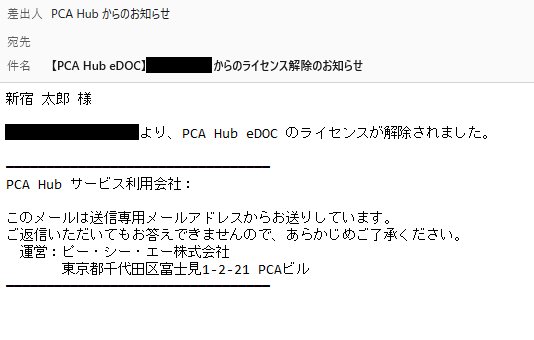 (4) ライセンスを解除したユーザーのメールアドレスに、【PCA Hub eDOC】ライセンス解除のお知らせが送信されます。