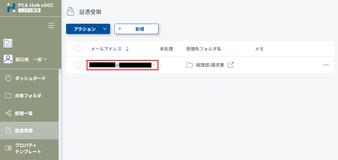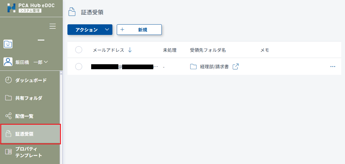 eDOCシステム管理メニューの「証憑受領」をクリックします。