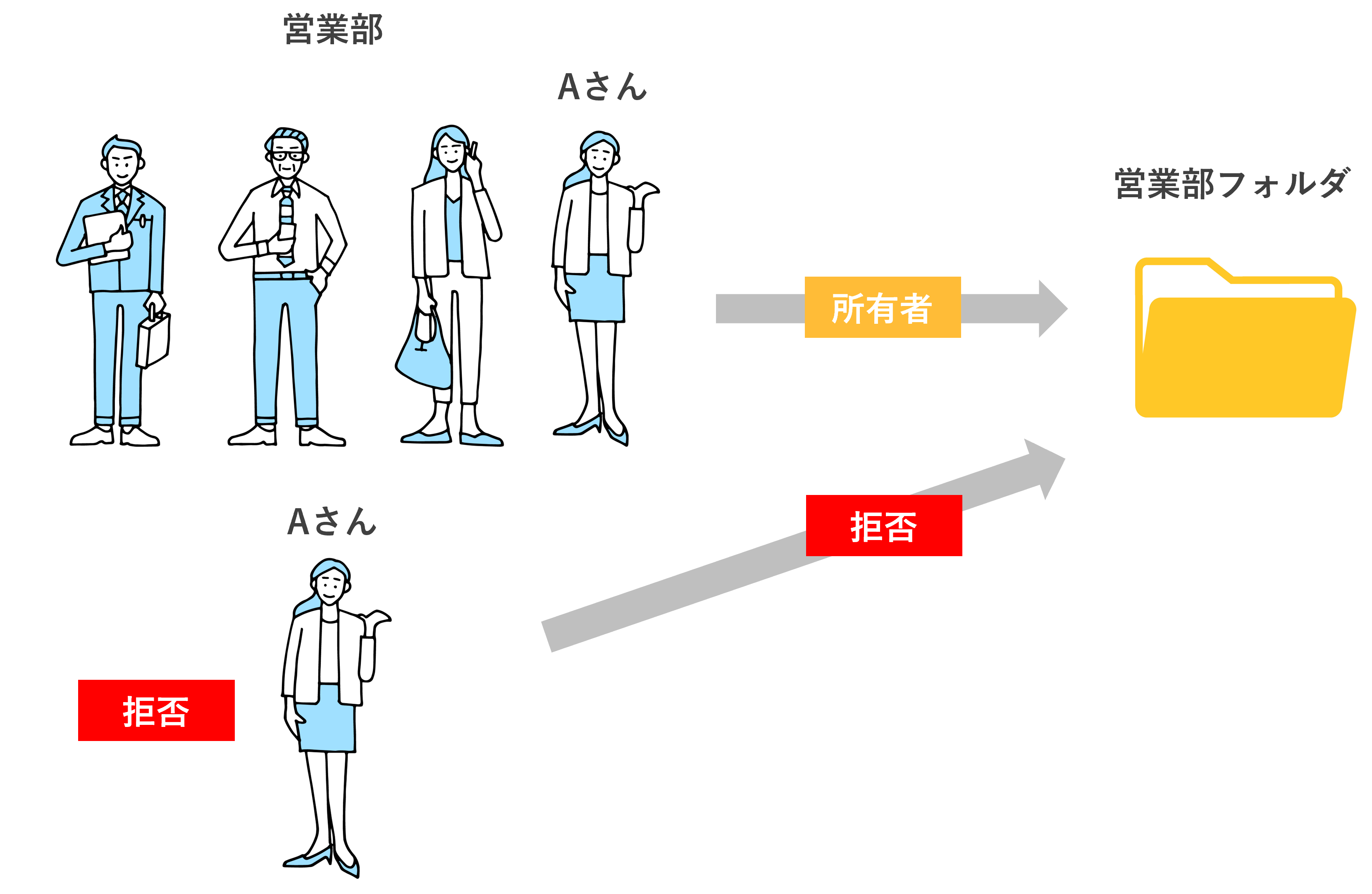 Aさんは[拒否]となります。営業部フォルダにアクセスする事ができません。