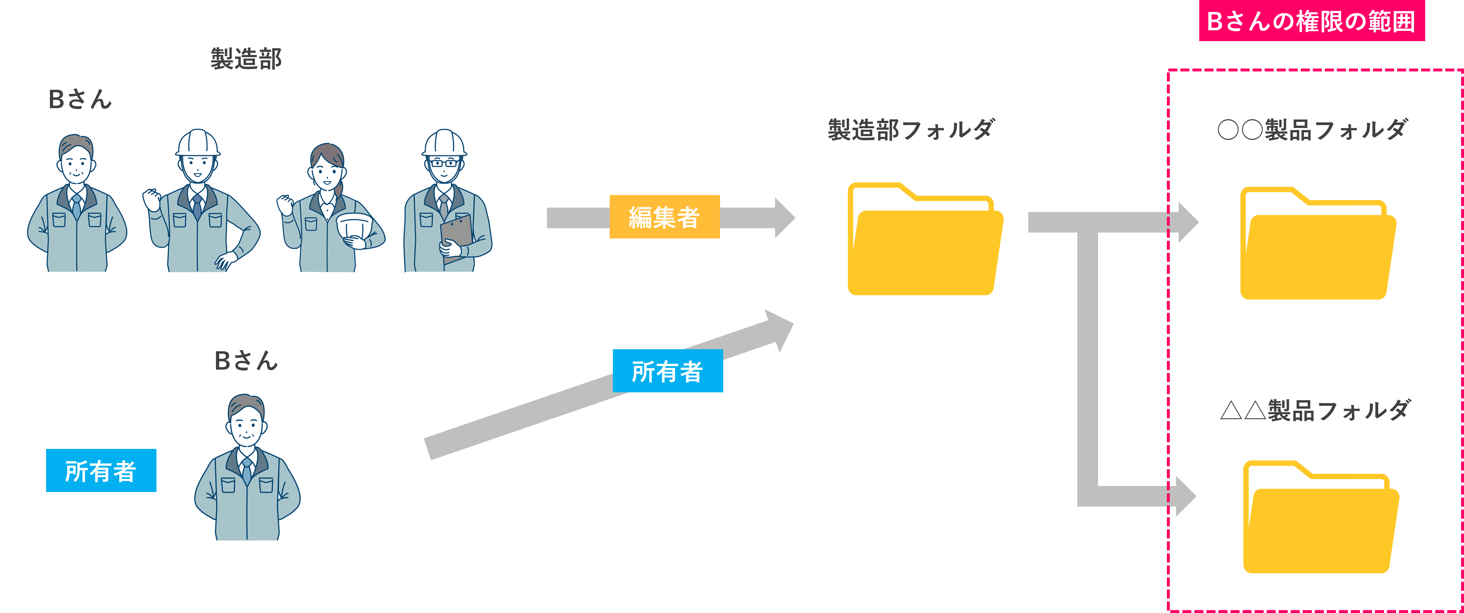 Bさんは[所有者]となります。製造部フォルダに対して、[所有者]のアクセス権限レベルを持ちます。