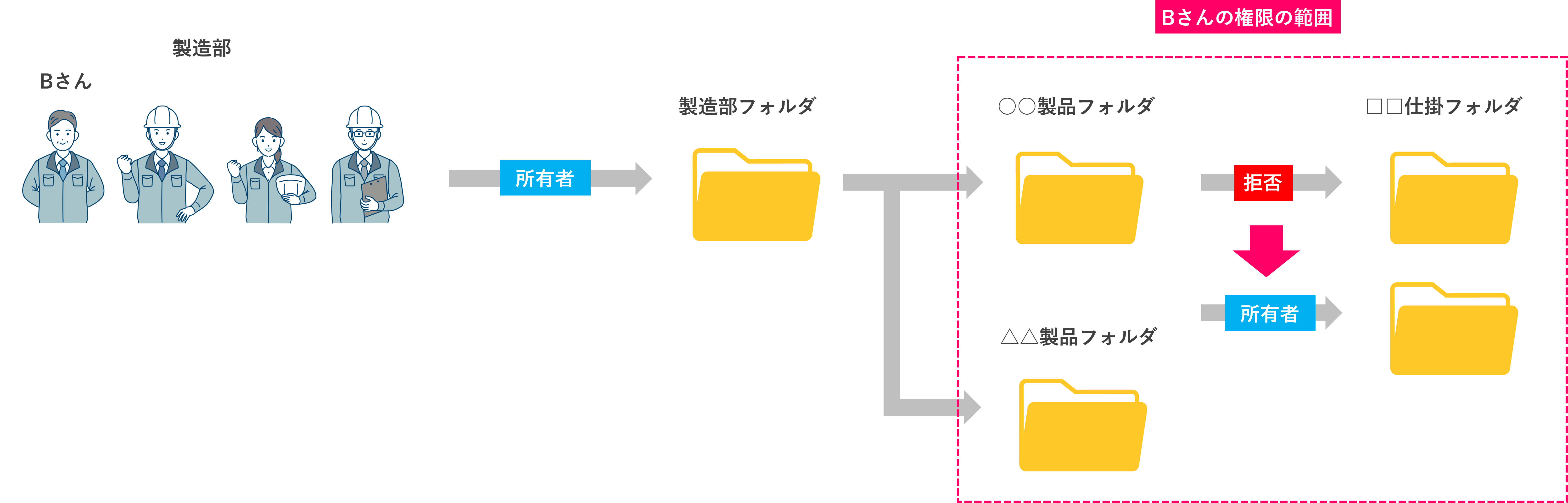 Bさんの権限の有効範囲は、〇〇製品フォルダ、△△製品フォルダとなります。