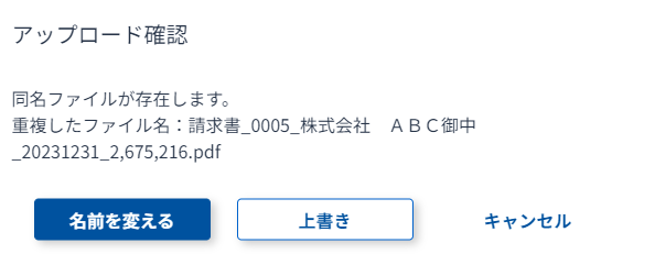 (3) 同一ファイル名の場合は、「上書き」を選択します。「名前を変える」を選択した場合は、通常通りアップロードされます。