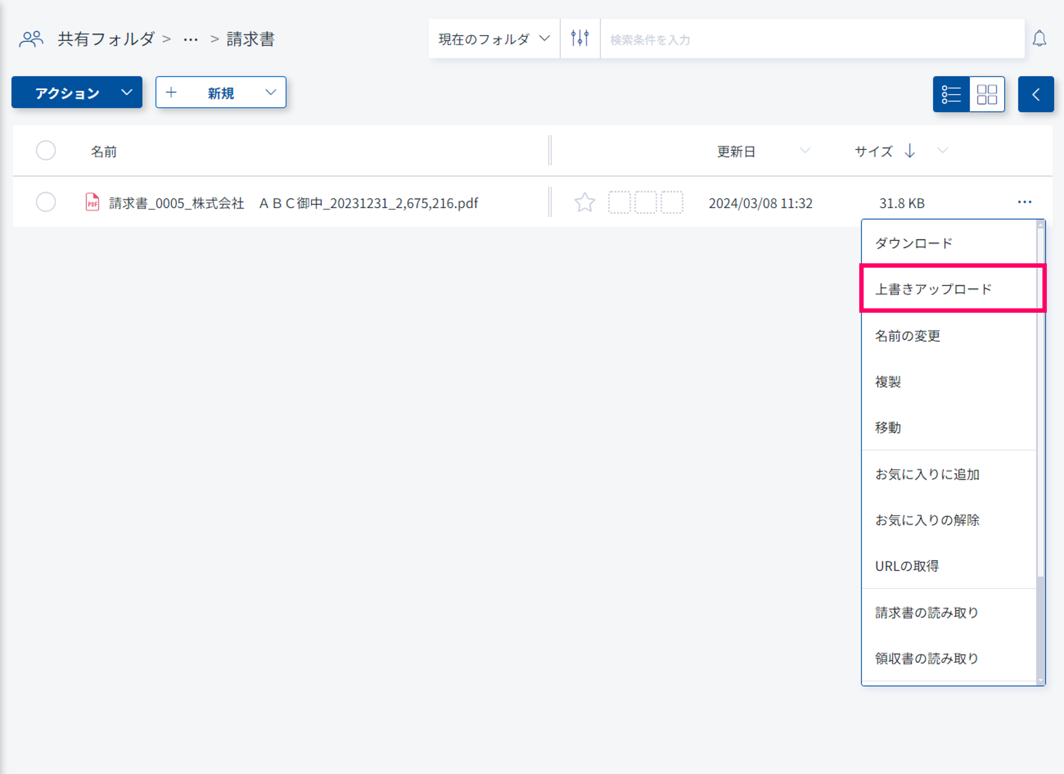 (1) 同一ファイルとしてアップロードするファイル横のから「上書きアップロード」を選択します。