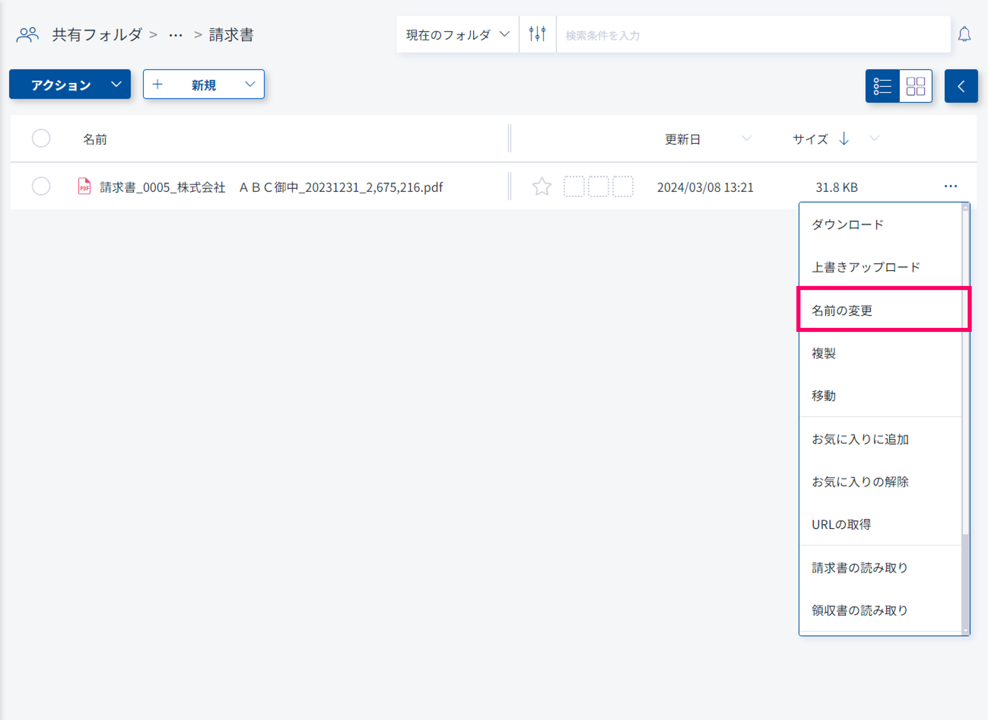 (1) ファイル・フォルダ横のから「名前の変更」を選択します。